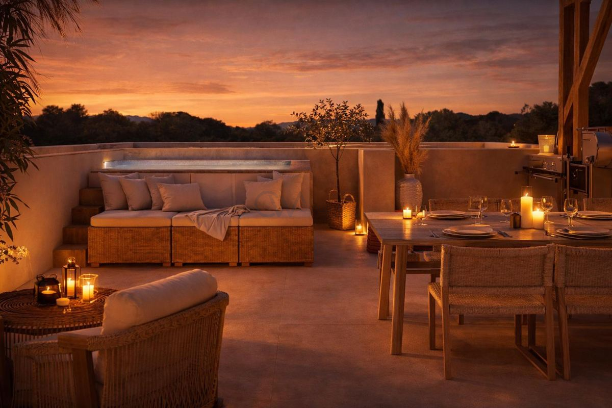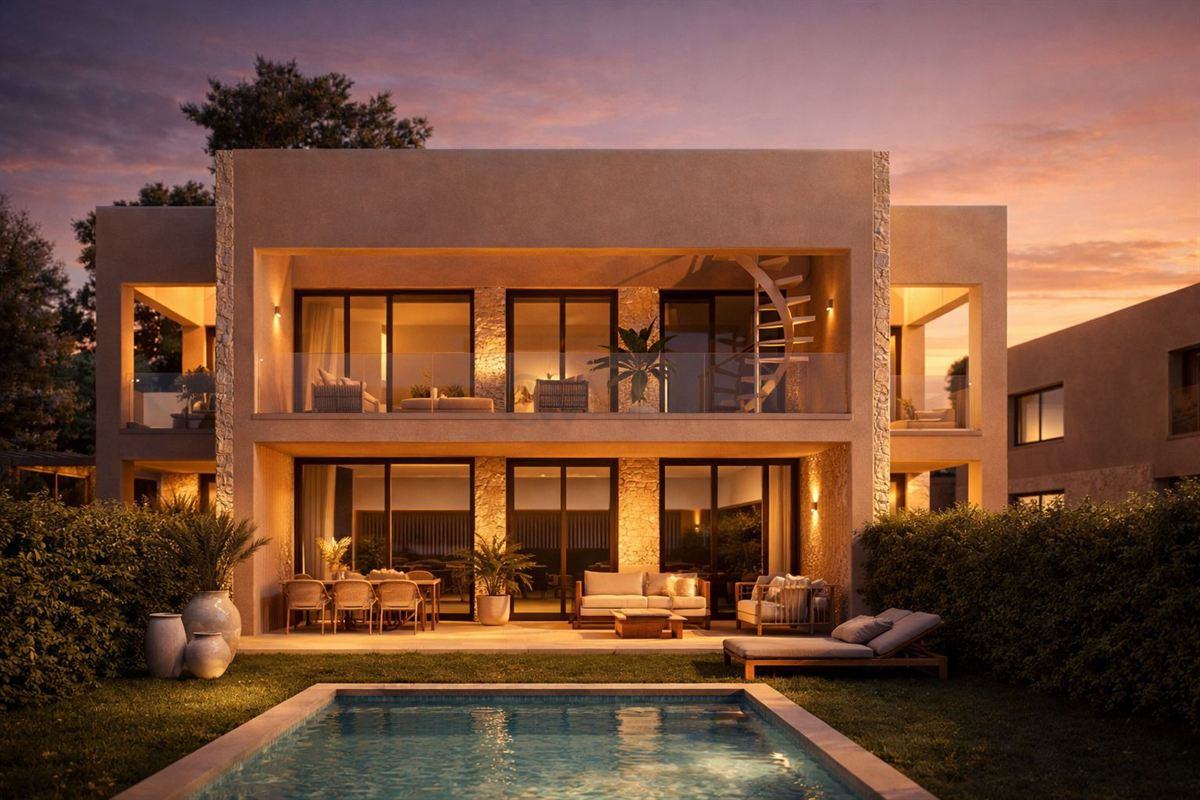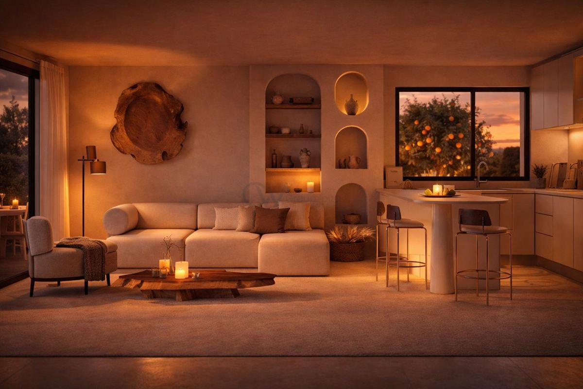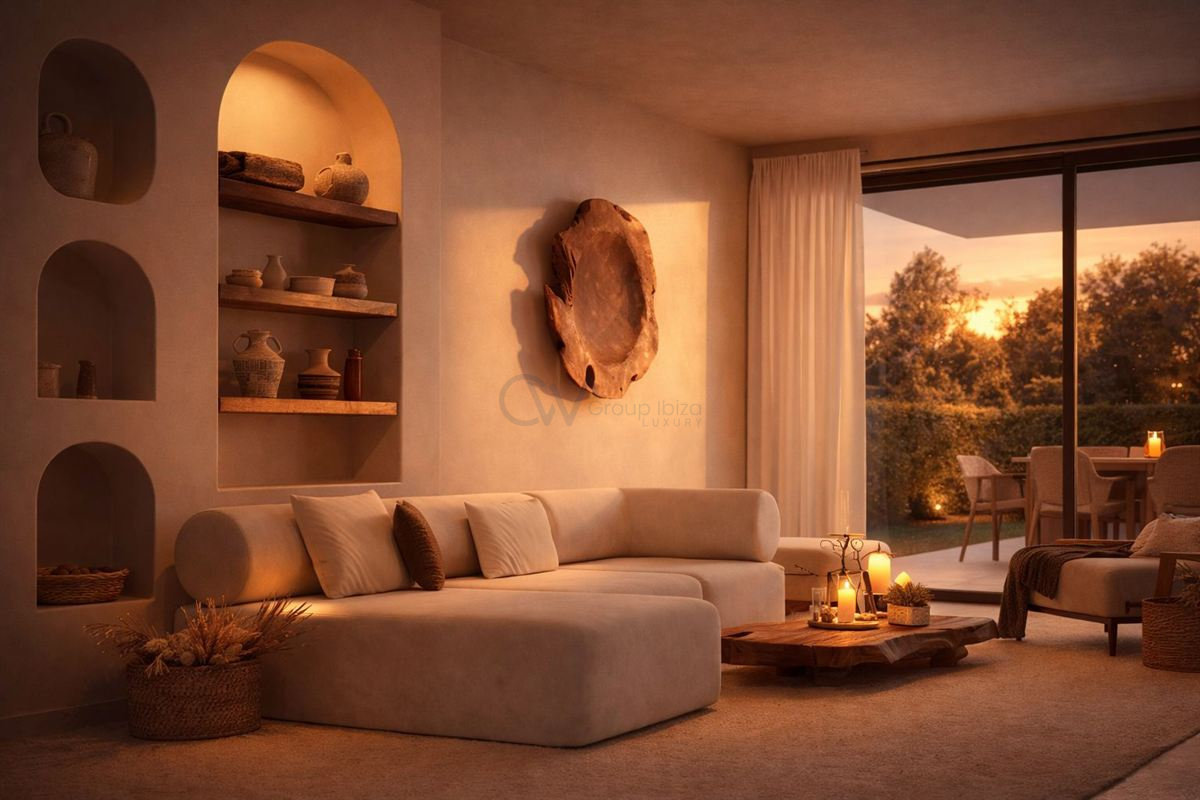 Inside, the interiors reflect a refined Mediterranean style, combining natural light with clean architectural lines and high-end finishes. Fully furnished and inspired by Ibizan aesthetics, the home features neutral tones, light wood, and traditional Marés stone. Additional features such as air conditioning, a private garage, and access to a swimming pool further enhance comfort, creating a calm and sophisticated living environment.