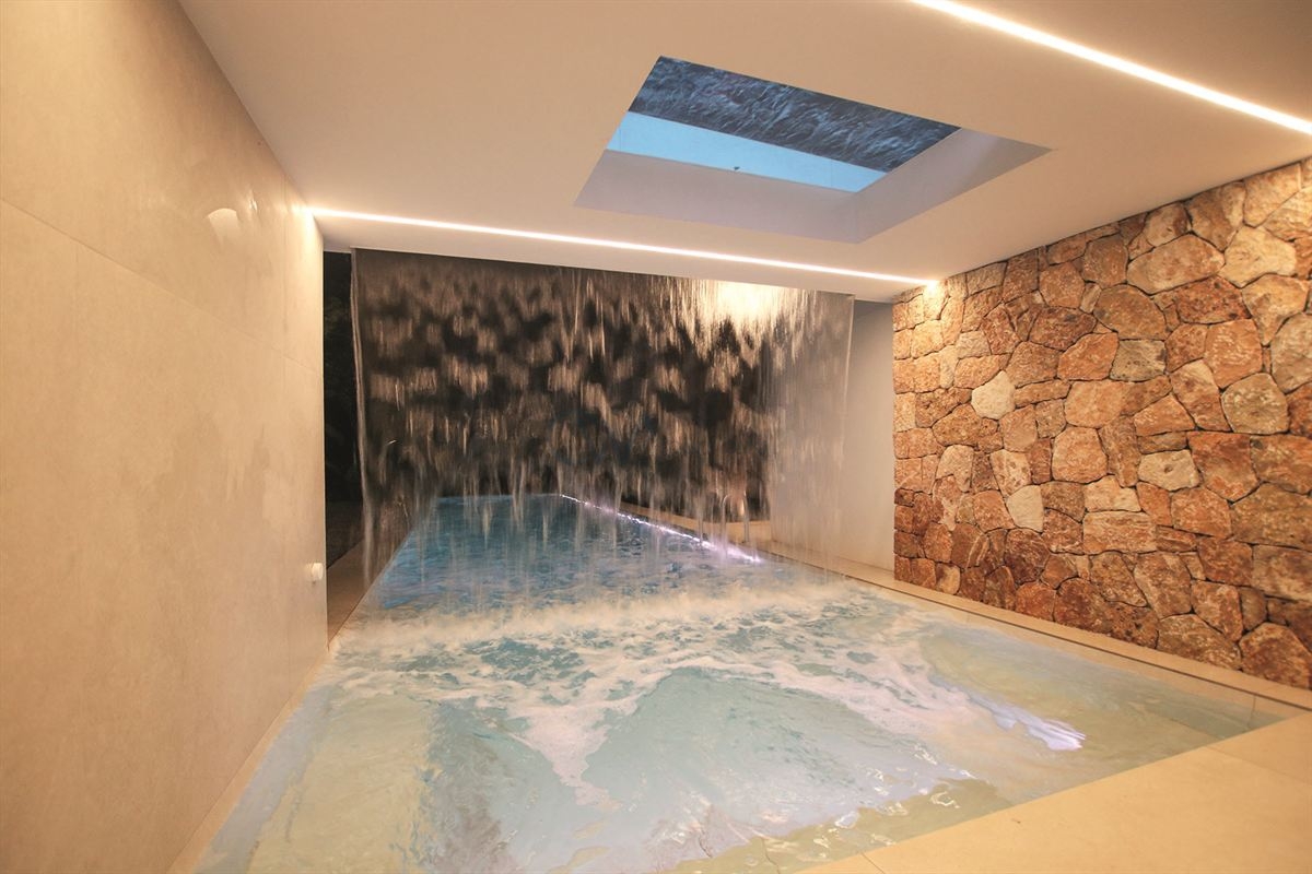 Die moderne Struktur erstreckt sich über drei Etagen, wobei sich zwei freitragende Ebenen anmutig über den üppigen Garten erstrecken. Ein Highlight des Außenbereichs ist der faszinierende Infinity-Pool, der durch einen Wasserfall ergänzt wird und eine einladende Oase schafft.