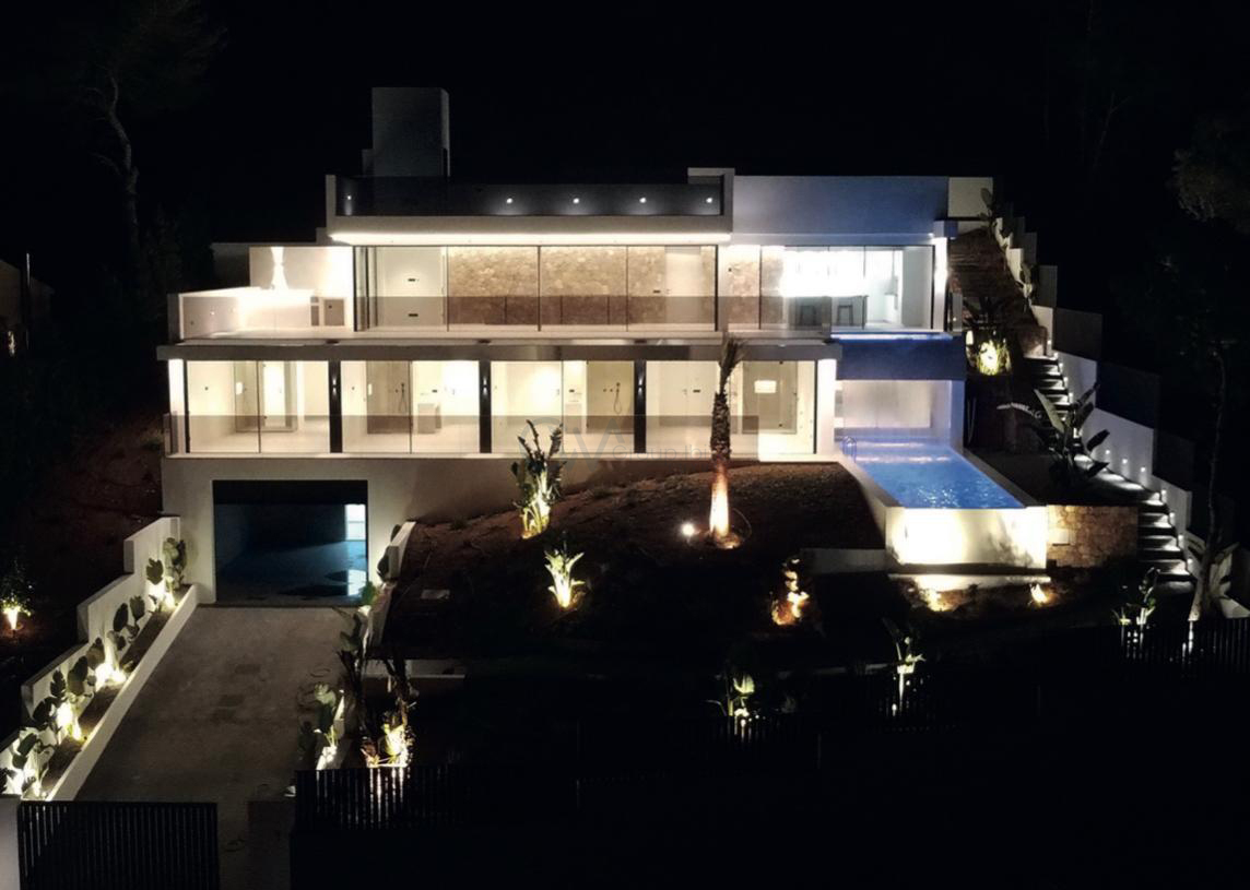 Disfrute de las impresionantes vistas del atardecer desde dos piscinas infinitas: una en la planta principal y otra en la terraza de la azotea, ideales para relajarse y disfrutar. La villa cuenta con 5 dormitorios con baรฑo en suite, lo que garantiza comodidad y privacidad. Un ascensor conecta cรณmodamente todas las plantas, mientras que las comodidades adicionales incluyen un sรณtano, un garaje con amplio espacio de aparcamiento para varios vehรญculos y varias terrazas diseรฑadas para disfrutar de la vida al aire libre.