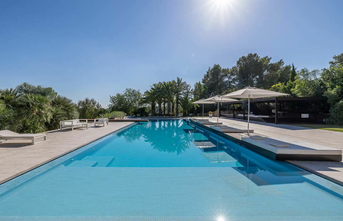 La piscina se encuentra junto a la gran terraza de 600 m2, donde se encuentra una gran pérgola cubierta de 112 m2 con mesa de obra para comer al aire libre. Se trata de una piscina rectangular de aguas cristalinas (22 x 7) con agua salada y tumbonas dobles. y sombrillas.