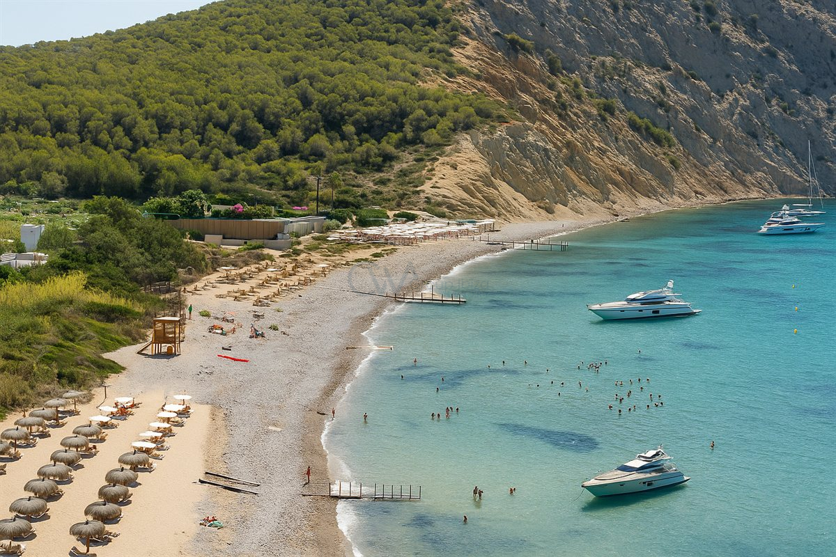 Ce qui rend Cala Jondal si unique, c’est son équilibre parfait entre nature sauvage et confort raffiné. Entourée de forêts de pins et de falaises imposantes, la baie offre un sentiment de liberté — toujours avec style. La plage est principalement recouverte de galets blancs et lisses menant à une mer cristalline. De nombreux clubs de plage élégants ont ajouté des terrasses de sable doux et des passerelles en bois pour offrir plus de confort et un accès facile à la mer.