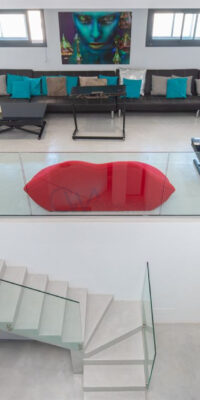 Inside, the villa offers generous living spaces spread across multiple levels. The main floor features a bright, open-plan living area with large glass doors that connect seamlessly to the outdoor terrace and pool. A fully equipped kitchen with high-end appliances ensures the home is both stylish and functional. The master bedroom has its own terrace access, with views of the sea, providing an idyllic escape to wake up to every day. The lower level of the home includes a self-contained guest apartment, complete with a bathroom, patio, and storage area. The highlight of this space is the professionally designed nightclub, featuring soundproofing, lighting, and a bar—an extraordinary feature unique to this home.