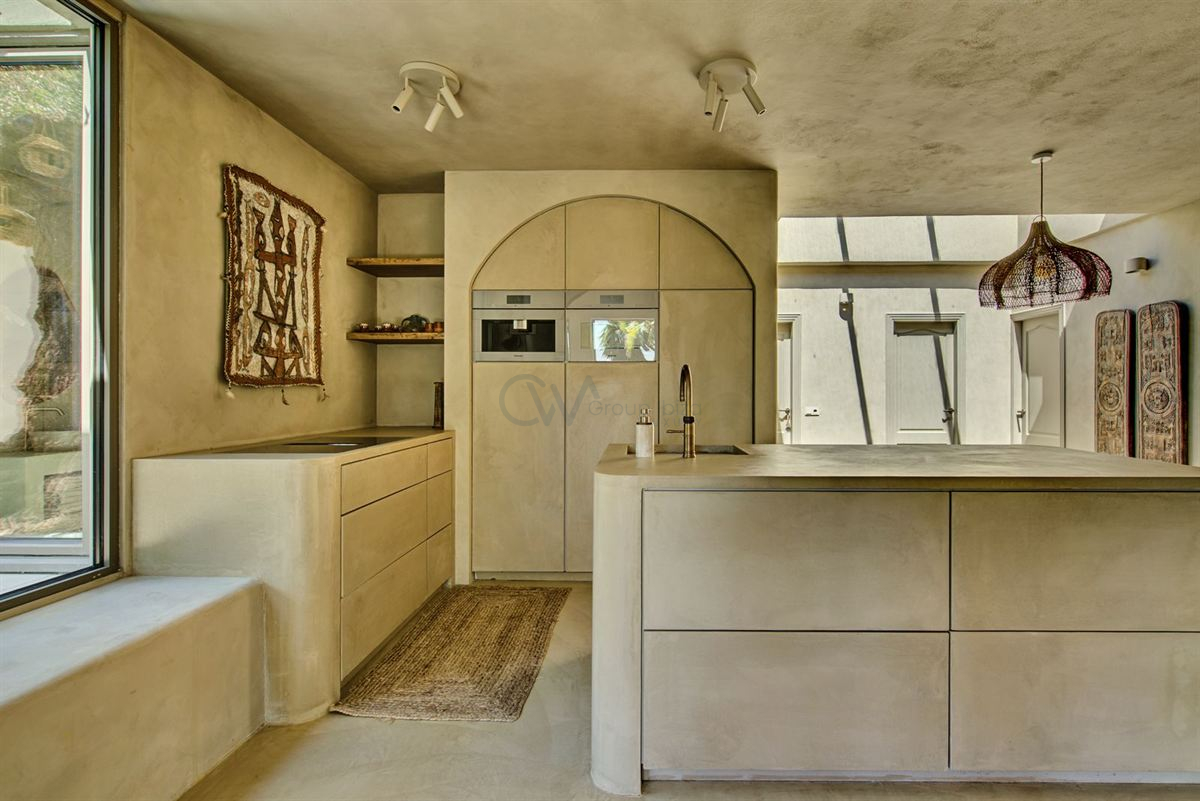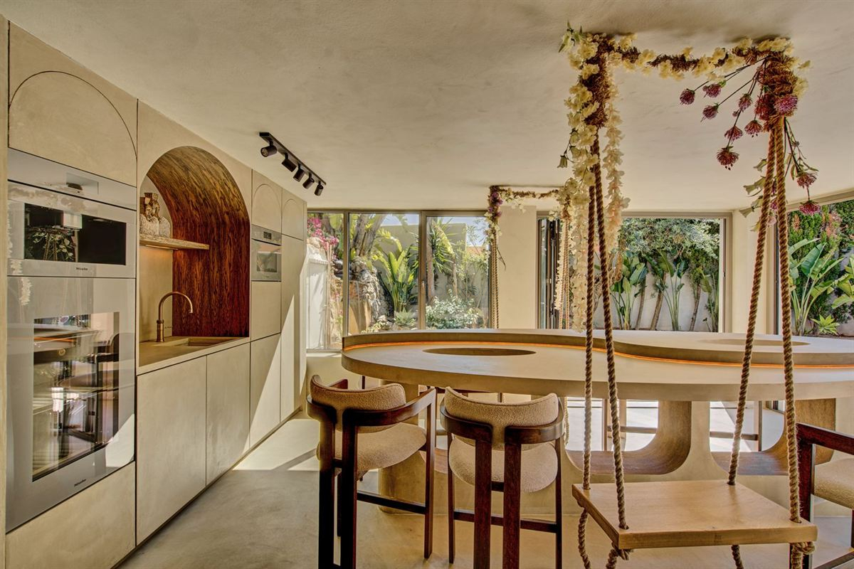 The villa is thoughtfully distributed over two independent levels, creating flexibility for living and entertaining. The main floor features an impressive entrance hall that opens into a bright and spacious living and dining area with large panoramic windows. A modern open-plan kitchen with a central island and high-quality appliances completes this level. The lower floor includes a second fully equipped kitchen, a dining area with a distinctive oval yin-yang table, and multiple lounge spaces designed for relaxation. In total, the property offers seven bedrooms and six bathrooms, including several en-suite rooms.