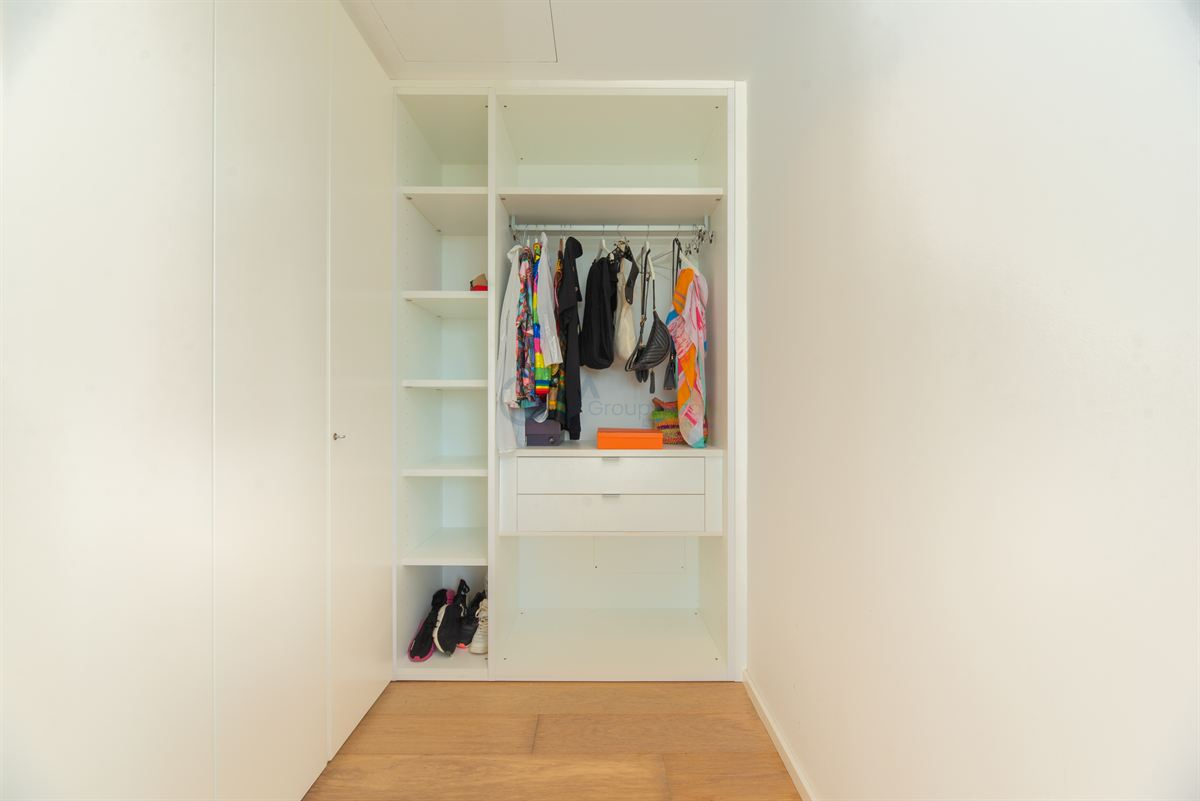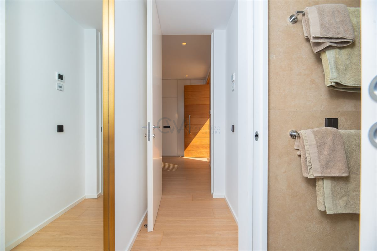 The interior living areas are filled with natural light thanks to expansive glass walls that open seamlessly to the outdoor spaces. A modern designer kitchen equipped with high-end appliances connects to a stylish dining area, making it ideal for both everyday living and entertaining. Comfort is enhanced with features such as underfloor heating, air conditioning, electric sliding shutters, and a Loxone smart-home system, all designed to provide effortless modern living.