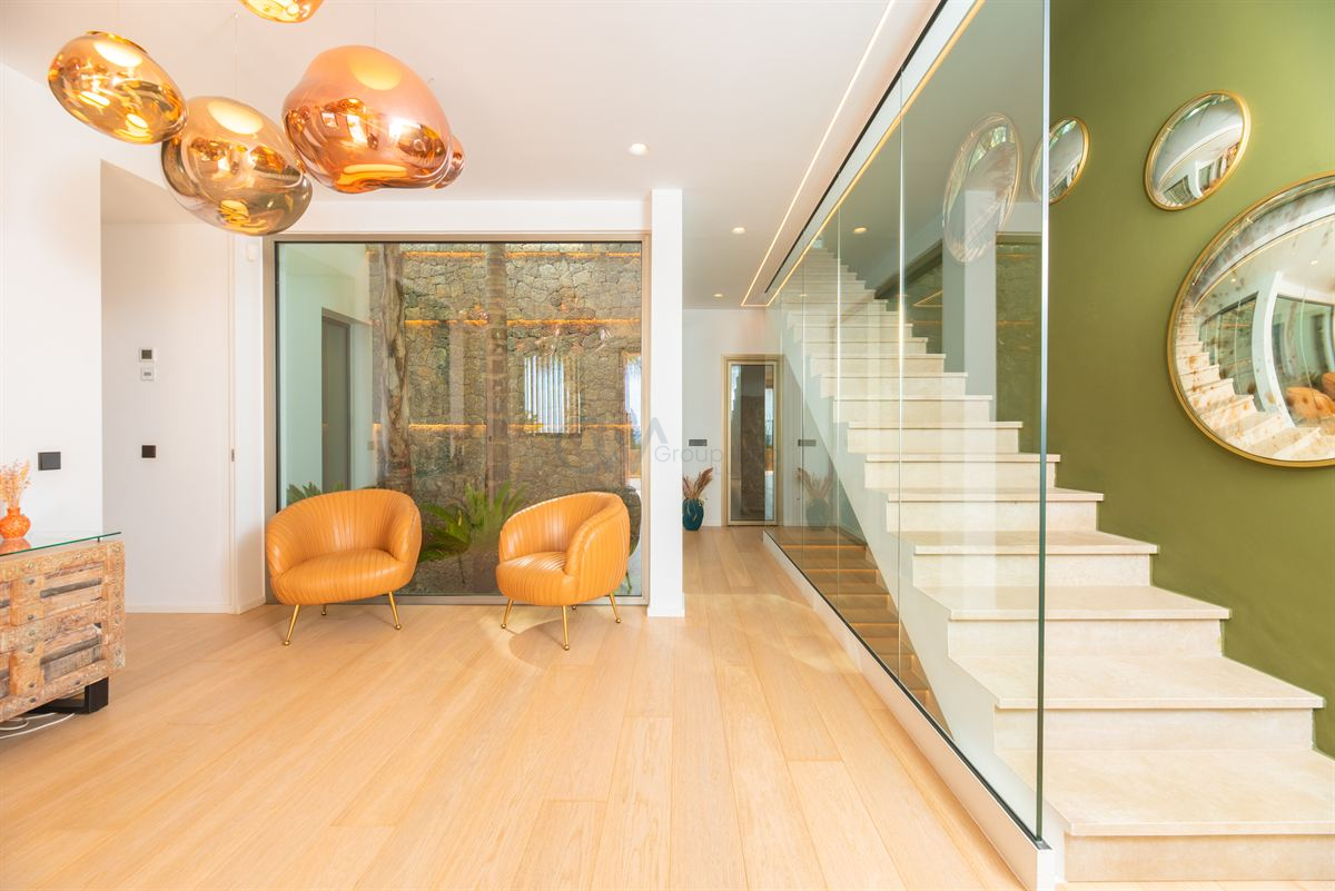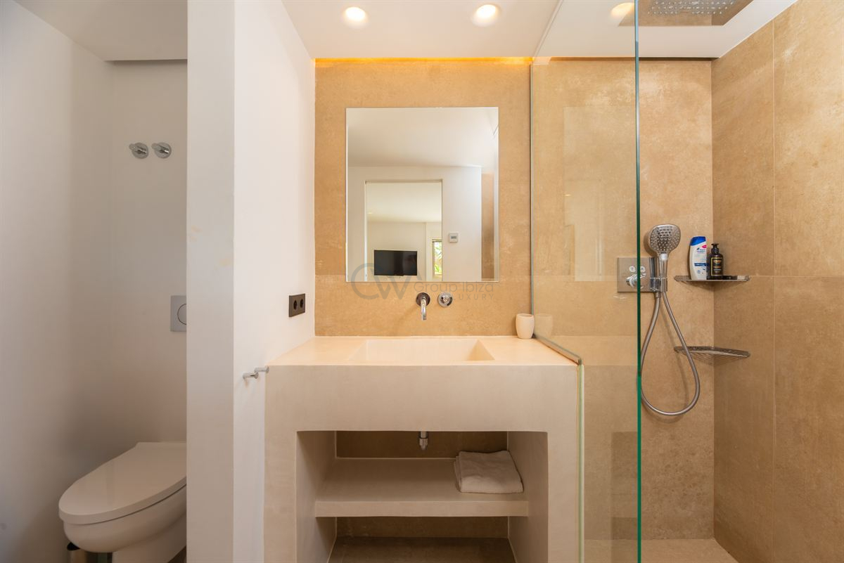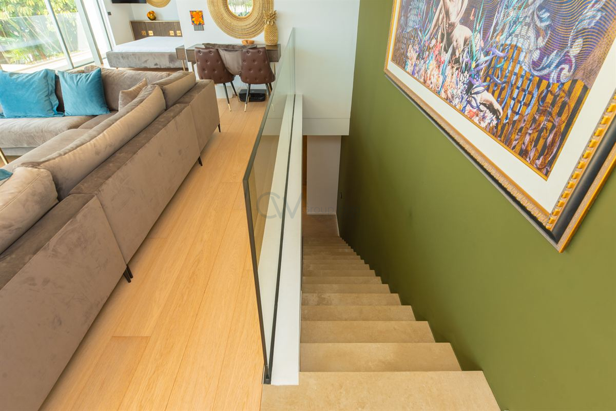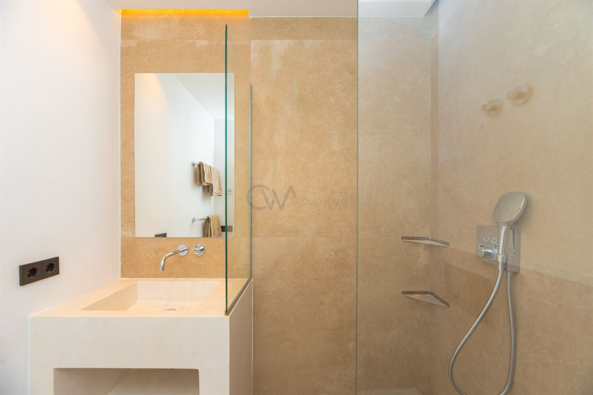 Outside, the villa offers beautifully designed spaces for relaxation and leisure. A heated infinity pool with luxury sun loungers forms the centerpiece, surrounded by multiple terraces, a covered lounge area, and an elegant outdoor dining space. The Mediterranean garden adds privacy and a natural atmosphere, while a bright winter garden provides additional space for dining and children’s activities. A large garage with capacity for five to six cars completes this exceptional property in one of Ibiza’s most exclusive locations.