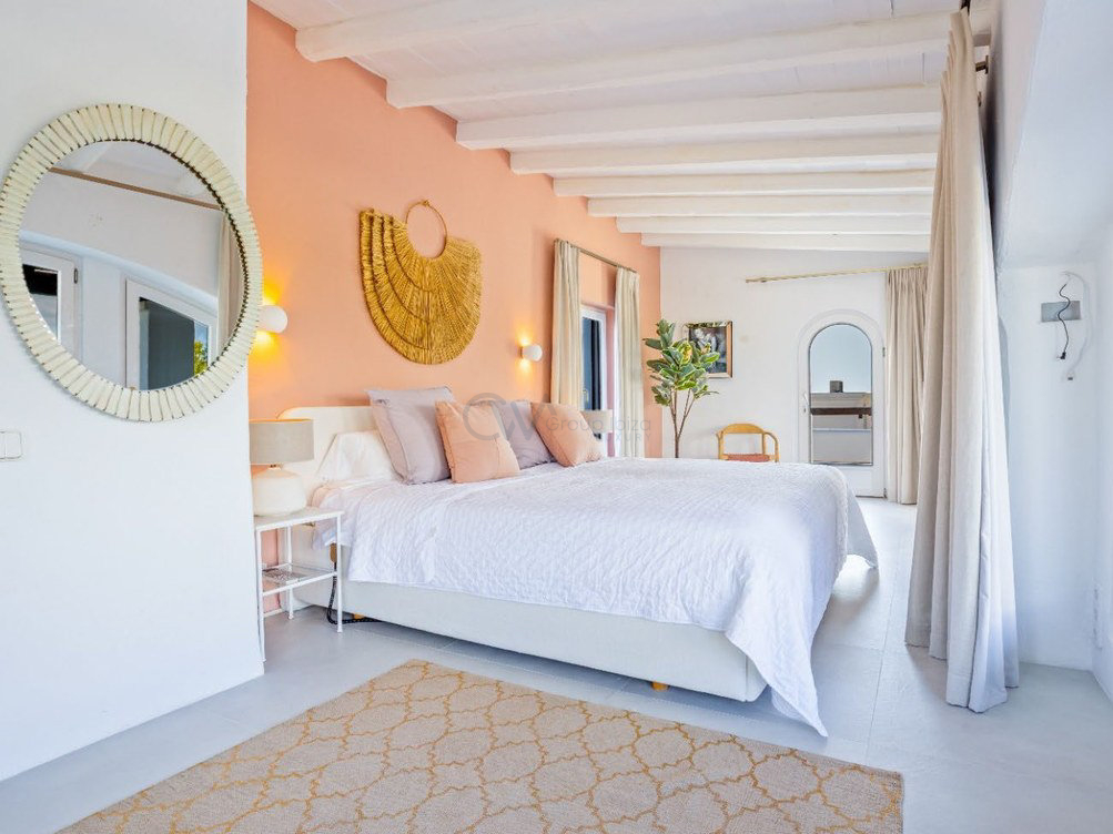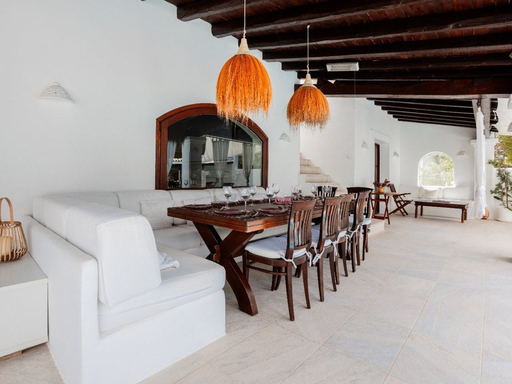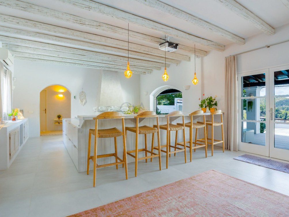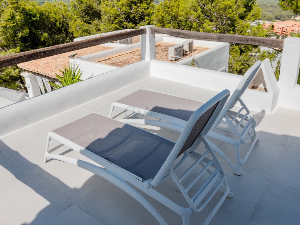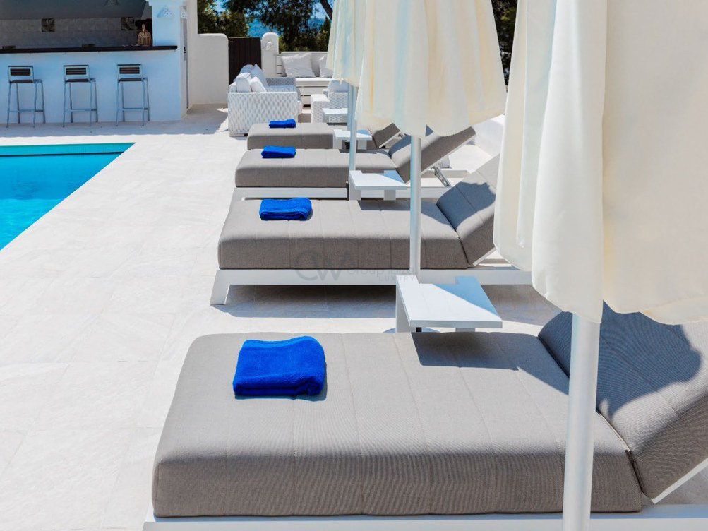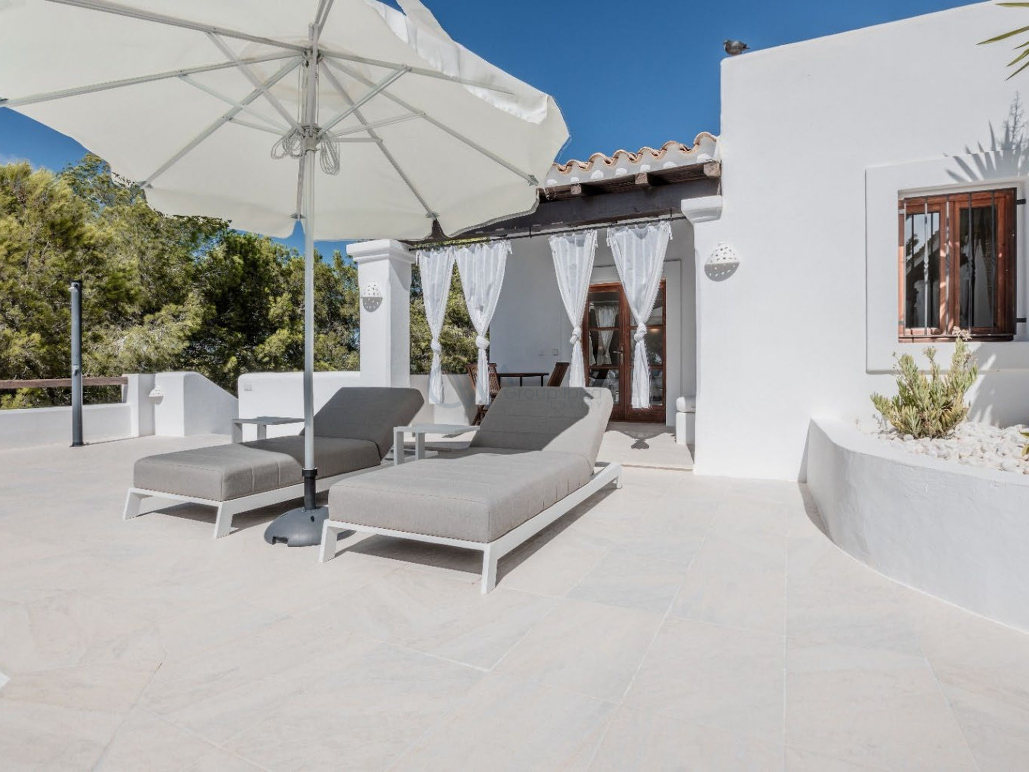 The outdoor living experience is equally captivating, with a large private heated swimming pool, stylish lounging areas, and an elegant outdoor bar perfect for sunset cocktails. Surrounded by nature and bathed in sunlight throughout the day, the villa offers multiple shaded terraces and rooftop spaces ideal for relaxation, yoga, or entertaining under the Ibizan sky.