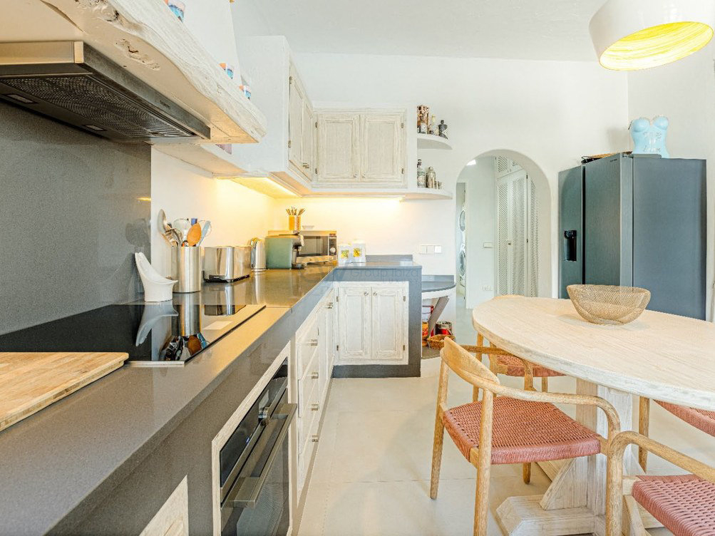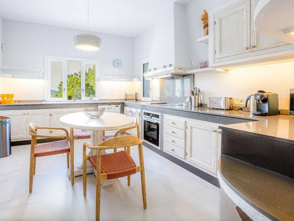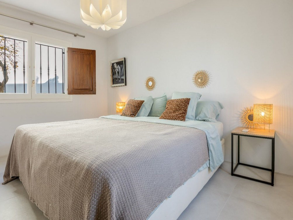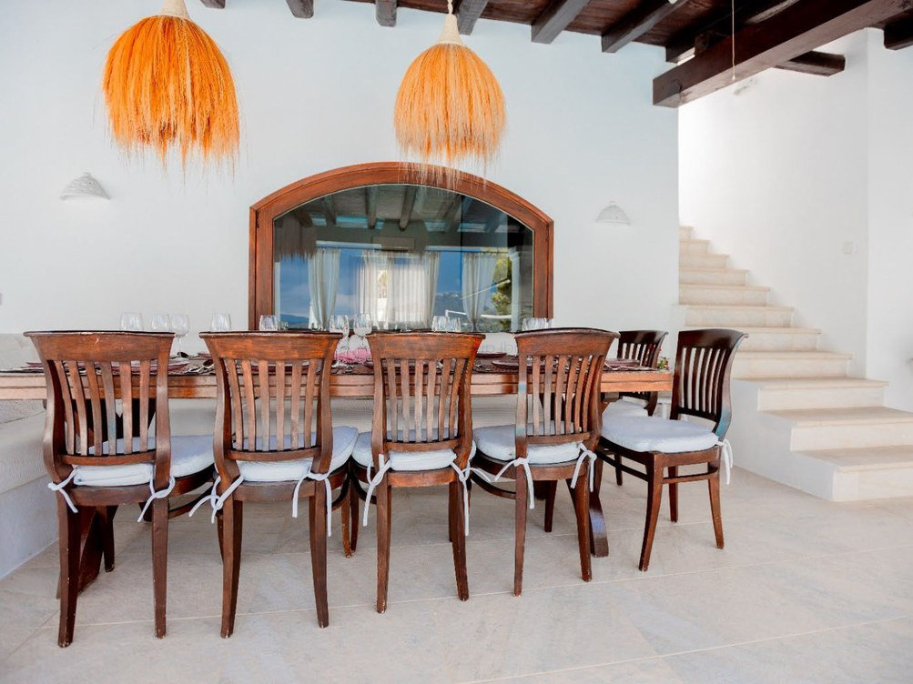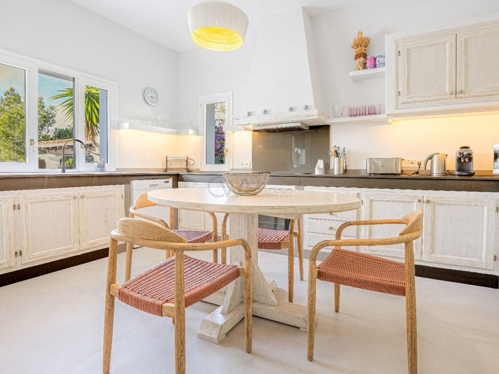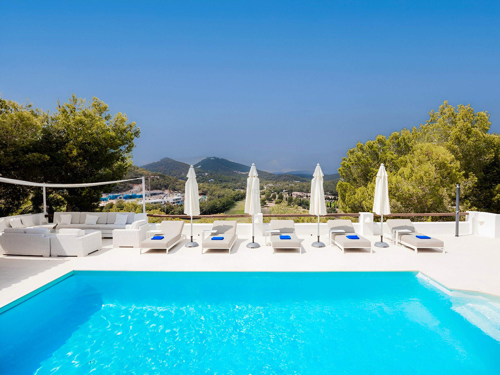 The outdoor living experience is equally captivating, with a large private heated swimming pool, stylish lounging areas, and an elegant outdoor bar perfect for sunset cocktails. Surrounded by nature and bathed in sunlight throughout the day, the villa offers multiple shaded terraces and rooftop spaces ideal for relaxation, yoga, or entertaining under the Ibizan sky.