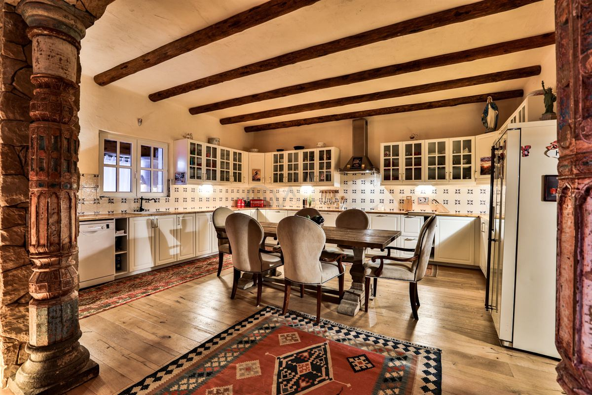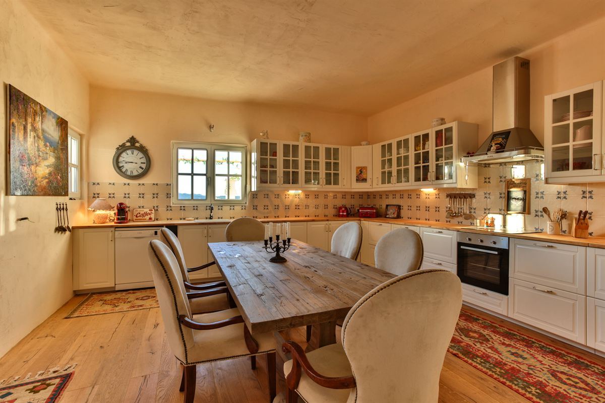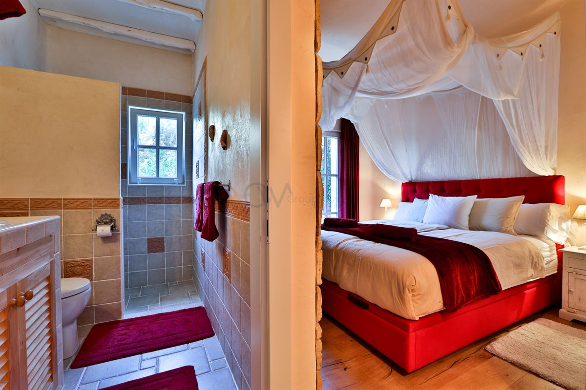 The interiors feature six beautifully appointed bedrooms and six bathrooms, with high-quality furnishings designed for maximum comfort. The villa accommodates up to 12 adults, with additional options including a side bed and baby cots. Each room is equipped with a TV offering international channels and a SONOS sound system, while underfloor heating and air conditioning ensure year-round comfort. A fully equipped main kitchen and a secondary kitchen in the guest house provide flexibility for hosting and entertaining.