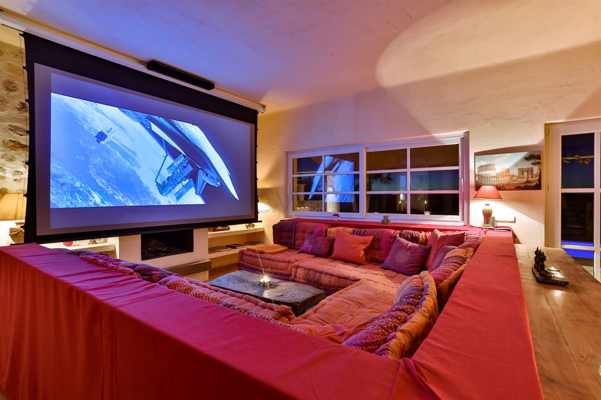 Outdoor living is equally impressive, with three terraces, landscaped gardens, and a spacious lawn area. The heated saltwater infinity pool, reaching up to 30°C, creates the perfect setting to relax while enjoying stunning sea and sunset views. Additional features include a home cinema with a large screen, fireplace, barbecue area, and full laundry facilities, ensuring a complete luxury living experience. This exceptional villa offers a rare balance of tranquility, security, and proximity to Ibiza’s key destinations, making it a perfect choice for those seeking refined island living with premium amenities.